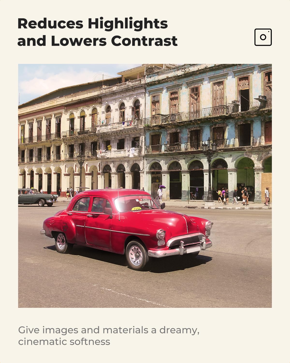 - Soft Highlight Flares, Lowered Contrast: This black diffusion 1/4 filter could soften facial skin's wrinkles, freckles, and pores, making it more delicate, plump, and gorgeous. The mist film effect can be better realized, showing the film effects dreamily.