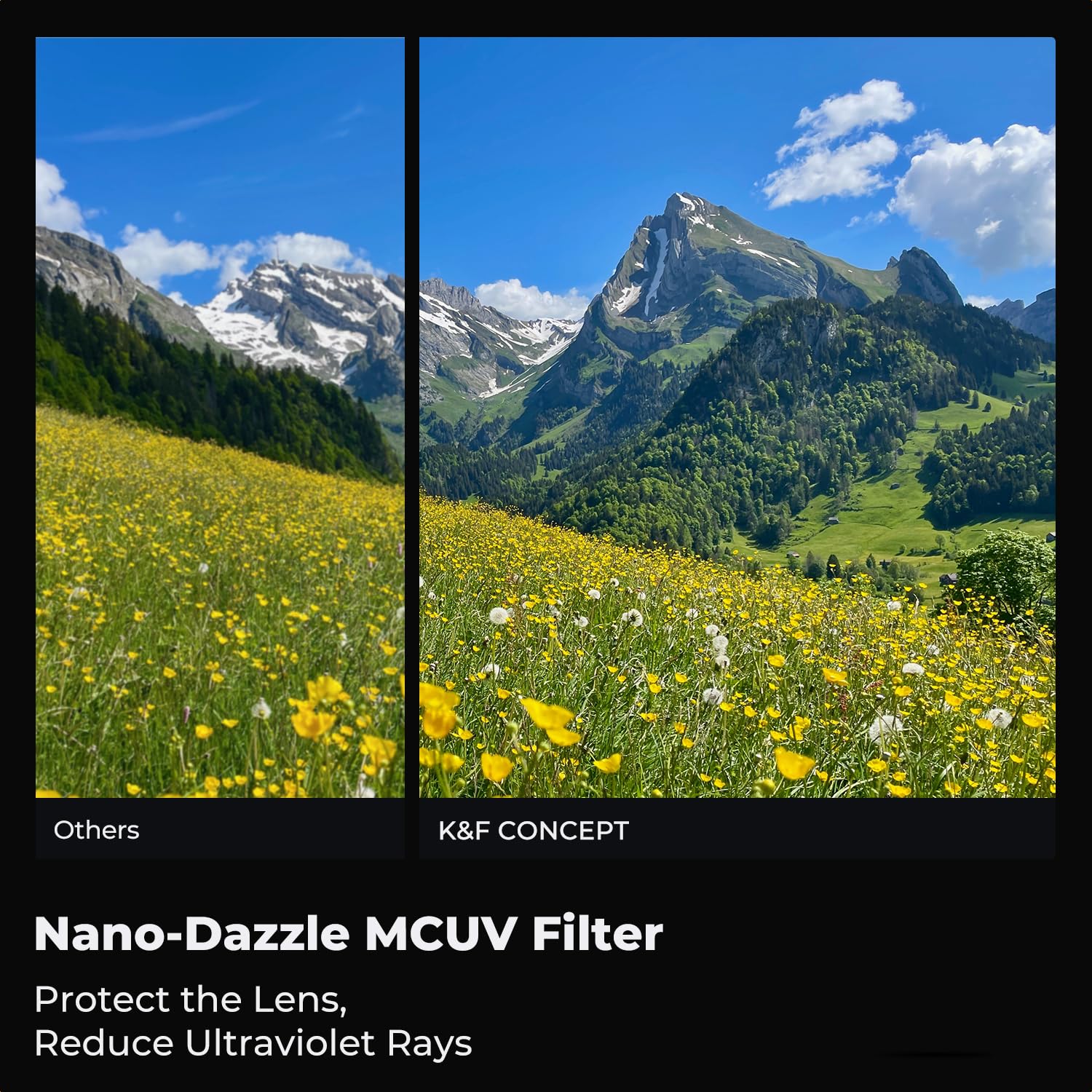 - ăTelephoto-FriendlyăWith its ultra-slim 3.3mm frame and double-side polishing technology, the K&F Concept MCUV filter ensures clear imagery even on telephoto lenses, with no vignetting.