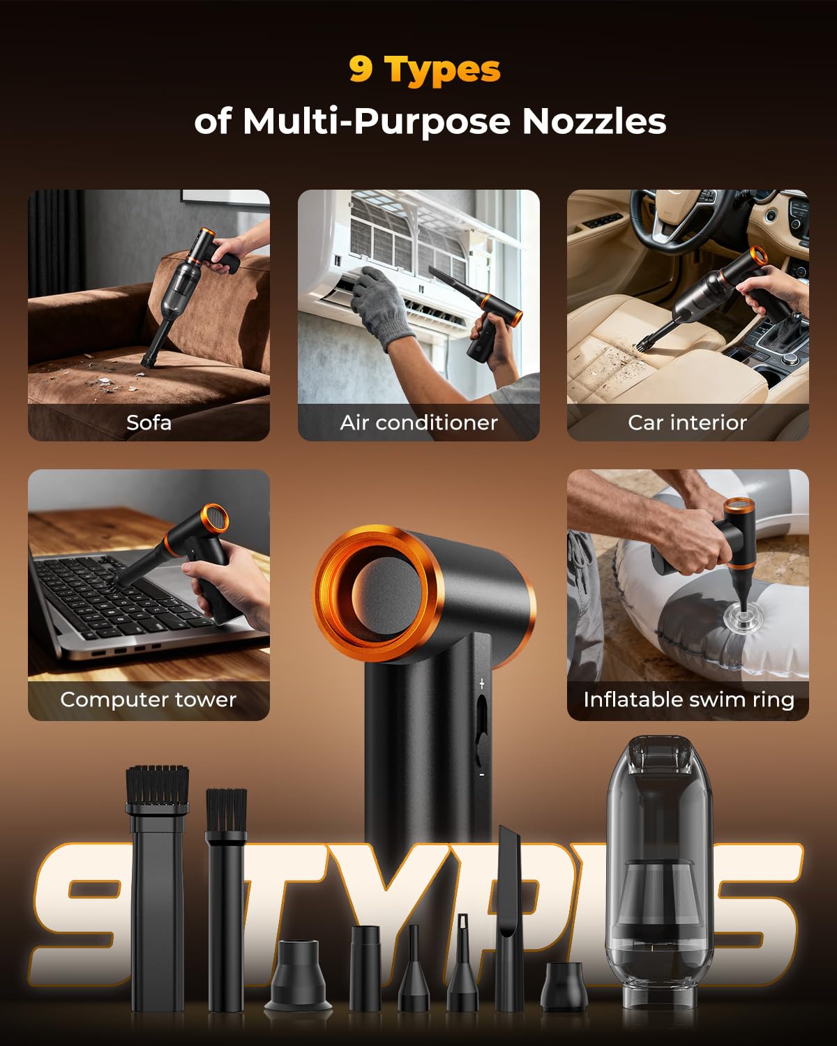 - Versatile Cleaning Tool - Equipped with 9 Nozzles + 3 Brushes + 5 Microfiber Cleaning Cloths + 1 Keyboard Puller, the K&F Concept electric air duster is perfect for cleaning electronics like PCs and keyboards, as well as for home, car, and outdoor use. Itās also great for inflating gear or managing campfires, making it a must-have for multiple scenarios.