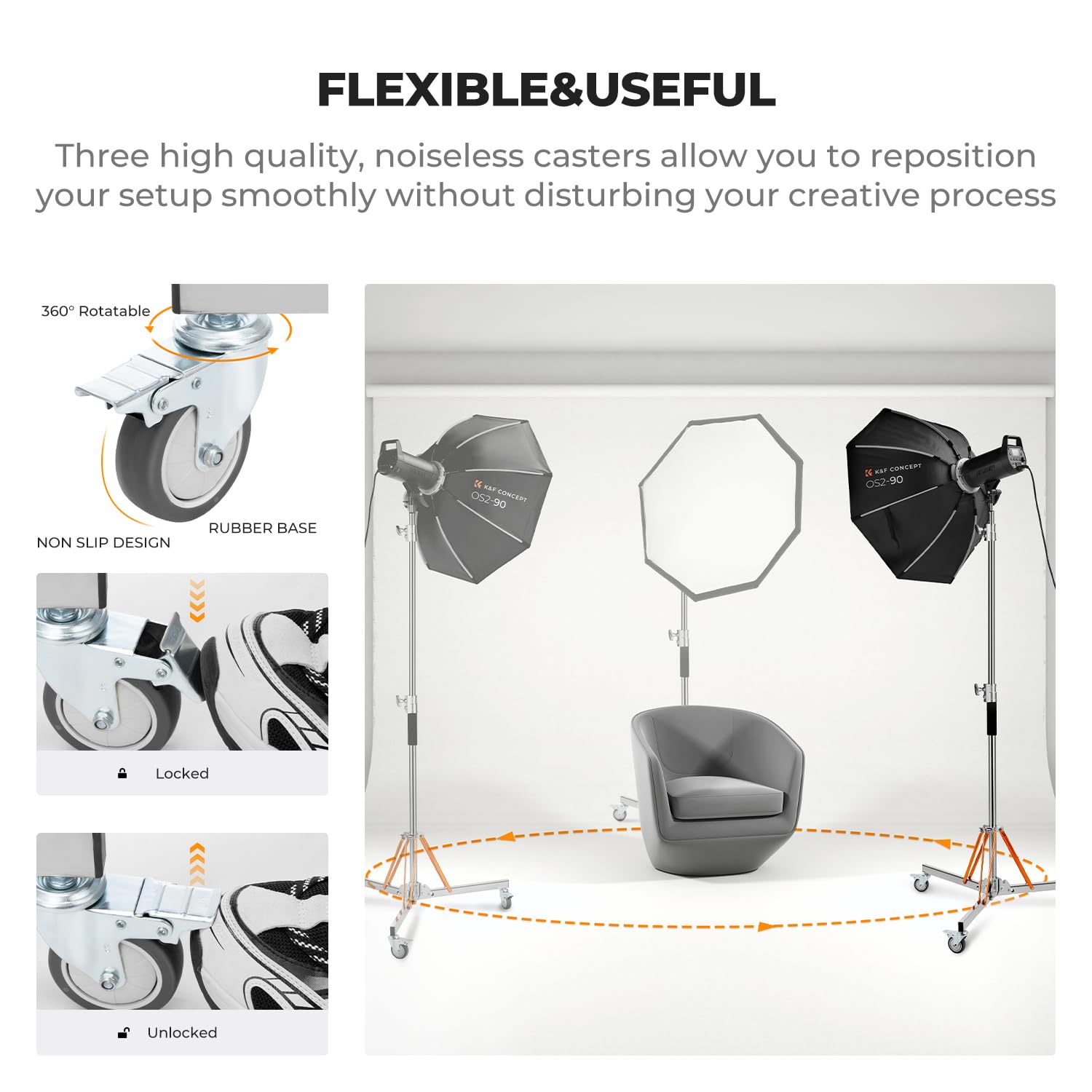 - 【360° Swivel Casters with Step-On Brakes】This professional heavy duty light stand features 360° swivel casters that glide smoothly across studio floors, carpeted surfaces, and outdoor flat terrain. The step-on brake system securely locks wheels to prevent accidental movement from cable pulls or bumps, ensuring precise lighting positioning. Rubber wheels protect hardwood floors, tiles, and delicate surfaces from scratches while providing stable mobility.