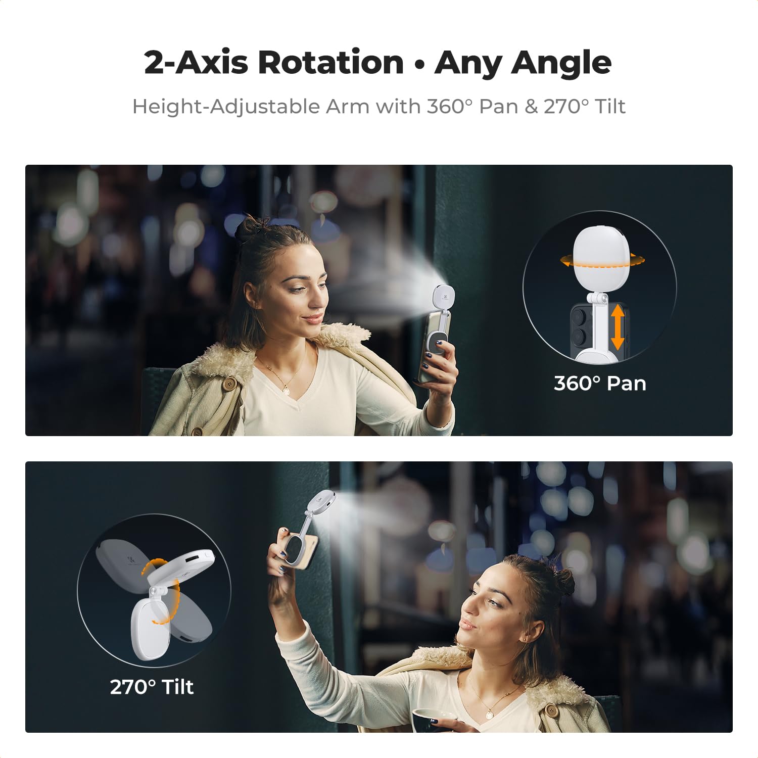 - Full-Angle Dual-Axis Rotation & Phone Stand Options- With 360°horizontal rotation, 270°vertical tilt, and an extendable connecting rod, this adjustable phone light supports portrait & landscape shooting without blocking telephoto lenses,This 360° rotation system provides optimal illumination for both selfies and background lighting, making it ideal for content creators who need quick transitions between different shooting scenarios.. It doubles as a stable phone holder for hands-free Zoom calls, TikTok videos, and makeup tutorials.