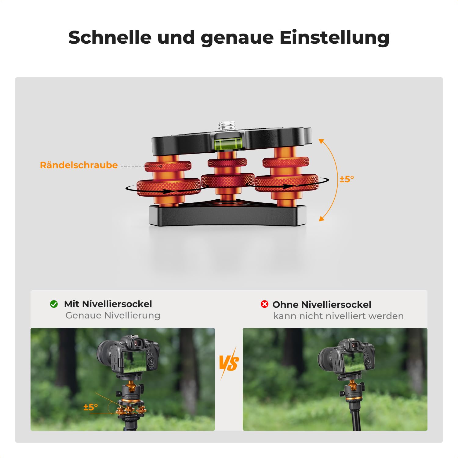 - Precision Adjustment: Tripod leveler stand features three wheels at the base for precise adjustment of camera/tripod or head angles. Allows fine-tuning within a range of -/+5°, with a minimum height of 40mm and a maximum adjustable height of 46mm, ensuring ideal leveling on uneven surfaces. Each wheel can be easily rotated for angle adjustments.